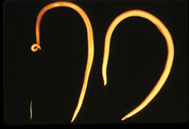 Ces deux vers allongés sont des Ascaris : Ascaris suum en particulier. Il parasite l'intestin grêle du Cochon. D'autres Ascaris, légèrement différents, parasitent d'autres Mammifères, ... y compris l'Homme.