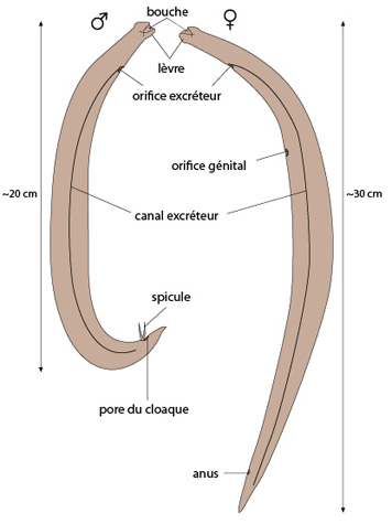 Ce schéma illustre les caractéristiques externes des individus de l'Ascaris. Il est dioïque, c'est-à-dire que les mâles et les femelles sont des individus différents. Vous voyez le mâle à gauche et la femelle à droite : celle-ci est un peu plus grande et plus grosse que le mâle. Dans toute sa splendeur, elle mesure une trentaine de centimètres.