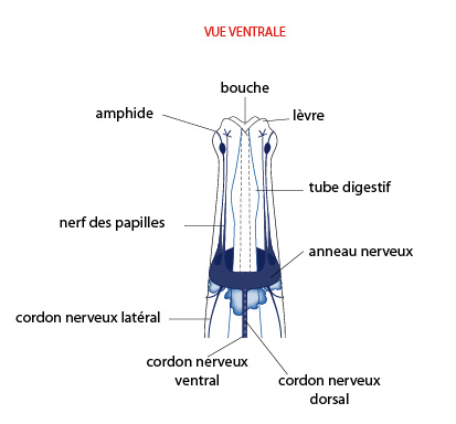 Le système nerveux, comme le tégument, est un dérivé ectodermique. Le cerveau est disposé en anneau autour de l'œsophage, comme un collier péri-œsophagien. Plusieurs cordons nerveux se détachent de ce cerveau. Les cordons nerveux antérieurs innervent la tête de l'animal, d'autres la partie postérieure du ver. Chez l'Ascaris, deux de ces cordons sont particulièrement développés : le cordon nerveux dorsal et le cordon nerveux ventral.