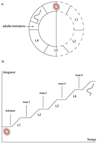 Le cycle vital de Caenorhabditis est rapide : en trois jours et demi à 20 degrés, le zygote se développe en adulte en passant par 4 stades larvaires. A première vue, les larves ressemblent aux adultes. Les plus grands changements sont la taille et la complexité de la gonade qui contient 4 cellules chez la larve, et 2.500 environ chez l'adulte mature.
