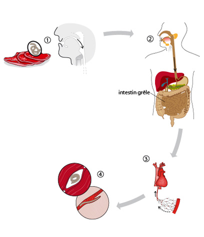 1. L'infection débute par l'ingestion de viande infectée et mal cuite qui contient le premier stade larvaire (L1) sous forme de kyste dans les tissus musculaires.