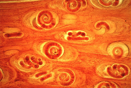 Cette photo montre une coupe d'un muscle où l'on voit de nombreuses larves de Trichinella spiralis, enroulées en spirale. En mangeant de la viande contaminée et crue (ou mal cuite, salée ou fumée), on peut attraper la maladie, qui s'appelle la Trichinose. Elle provoque des troubles intestinaux, de la fièvre, des douleurs dans les muscles, et peut même être mortelle. En Belgique, cette maladie est fort rare, grâce à la surveillance des abattoirs. Si le kyste peut survivre 30 ans chez l'homme, l'adulte, lui a une vie assez éphémère.