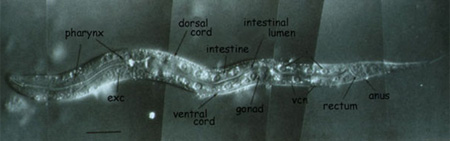 Voici le Nématode préféré dans ce type d'études : Caenorhabditis elegans. Il est petit, d'anatomie très simple, d'élevage facile, et propice aux manipulations génétiques. Son génome est même séquencé. Chez ces Nématodes, les divisions et les déplacements cellulaires sont ordonnés avec une grande précision. Les lignées cellulaires formant les différentes parties du corps sont les mêmes chez chaque individu. Ce phénomène a permis de suivre le développement de Caenorhabditis cellule par cellule, depuis l'oeuf jusqu'à l'âge adulte. Caenorhabditis est transparent, et l'on peut suivre les cellules lorsqu'elles se divisent, migrent et se différencient dans l'animal vivant.
